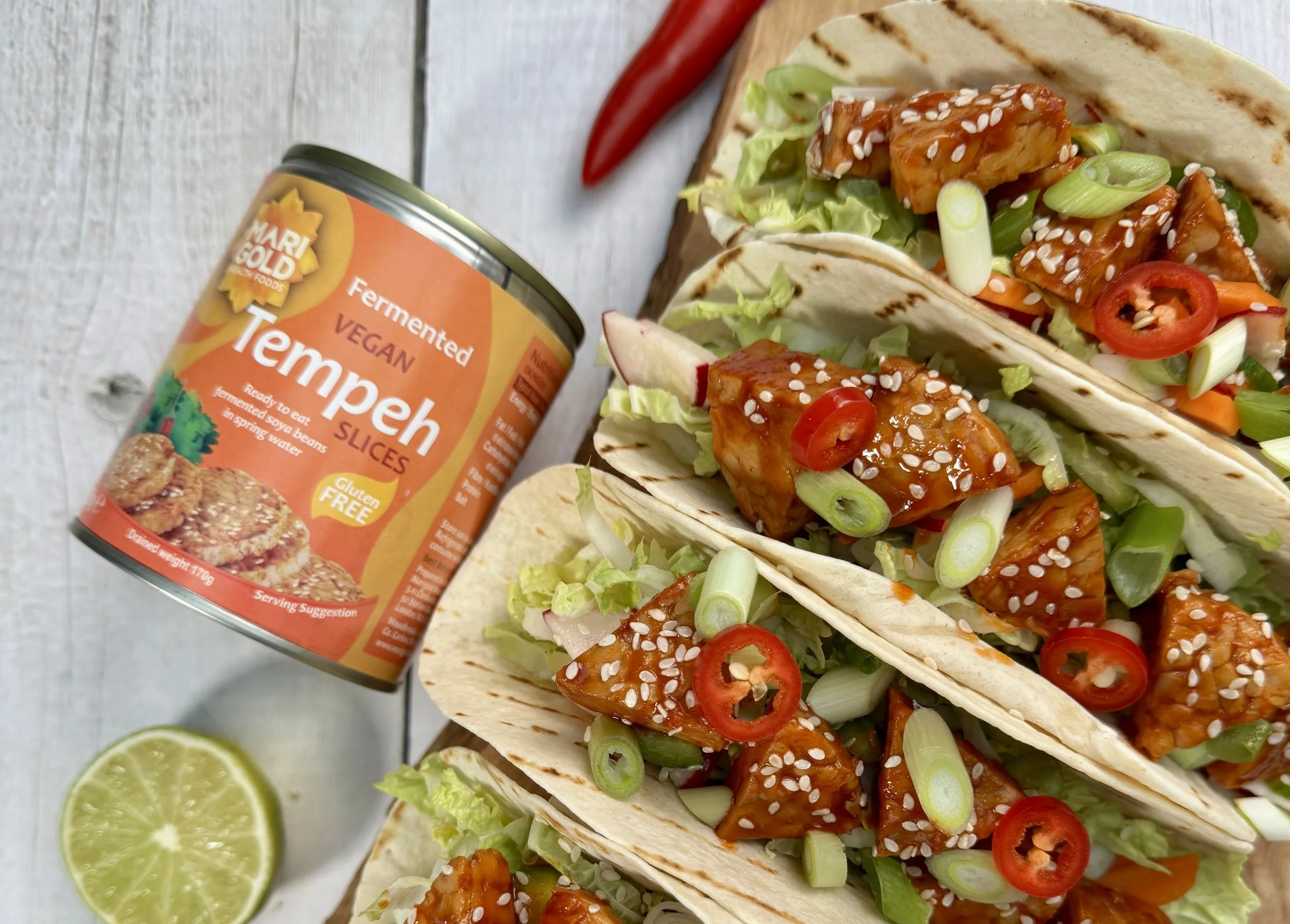 Assemble: grill tortillas on both sides. Spread gochujang mayo, add cabbage, pickled veg and tempeh. Finish with sesame seeds, spring onion and chilli.